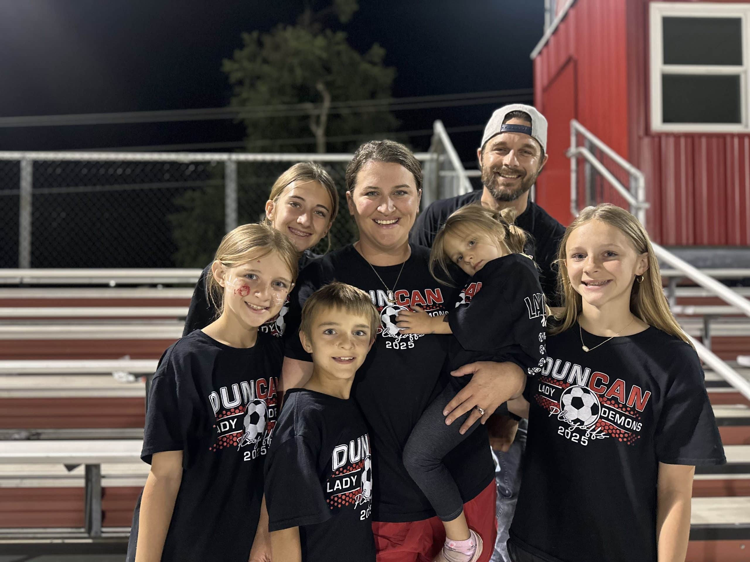 Williams has five kids enrolled in Duncan Public Schools. Peyton is a freshman at DHS. She runs cross country and track, and plays basketball and soccer. Brooklynn is a 7th grader at DMS and runs cross country, plays basketball, and soccer. Elsie is a fourth grader who plays soccer and basketball. Timmy is a third grader playing soccer and basketball. Oakley is in Pre-K, plays soccer, and is excited to continue in the family’s athletic tradition.