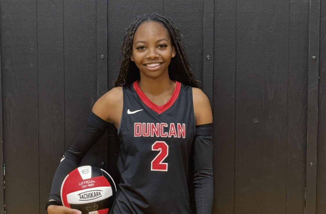Duncan High School’s La’Teiya Newberry, a sophomore middle blocker in volleyball, has been chosen as one of VYPE Sports’ “Character Counts” student-athletes for the month of October, and with good reason. La’Teiya, when asked about her biggest role models, named pretty much anyone in a position to make a positive connection, “My mom motivates me. Some of my other greatest influences are Coach Scott and Coach Jeffords, because they have always shown belief in me, and they push me to be my best, both as a person and as an athlete. I also feel I should mention Ms. Clauson, because she makes sure that I always have a smile on my face.” When asked what it takes to be her very best as an athlete, La’Teiya responded, “You have to have that mental toughness. I have to take the advice and instructions that my coaches give me, and I have to always remember not to go easy on myself.” When asked about her teammates, Newberry had this to say: “They are all great, but Makynna Skinner has probably had the most influence on me, because she is a great hitter and pushes me to work on blocking, but she still manages to have a lot of fun. One player who I feel deserves far more appreciation is Makiyah Skinner. She always hustles and gets her job done. She’s our setter, so she’s also the playmaker.” Balancing schoolwork, social life, and athletics is always a challenge to those who are involved in high school extracurricular activities, and when asked how she makes it all work, Newberry responded, “It’s sometimes difficult. You just have to be disciplined and have good time management.” La’Teiya also wanted to give a shout-out to the Duncan community. “I am so proud to be able to represent my school, and really, my entire community when I step onto the court. It means a lot, and I try to be a good role model on and off the court with my sportsmanship, character, self-control, pride, and the respect that I try to show others.”